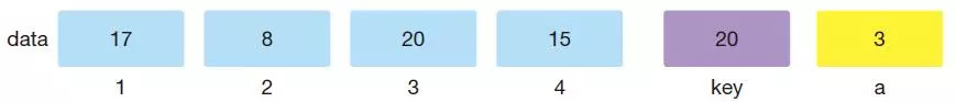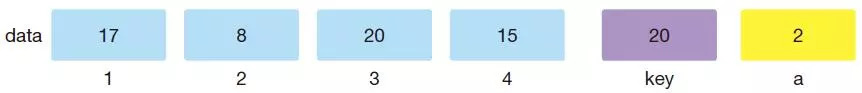 1. 将列表 data 设为 17、8、20、15。将变量 key 设为 20。将变量 a 设为 1。