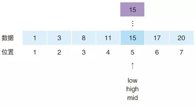 6. 再次计算 mid 位是第 5 位。因此将第 mid 位的数据(=15)与15进行比较,