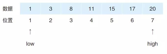 1. 该数组共有 7 个数据,将首项和末项的位置数(即 1 和 7)分别设为 low 和 high。