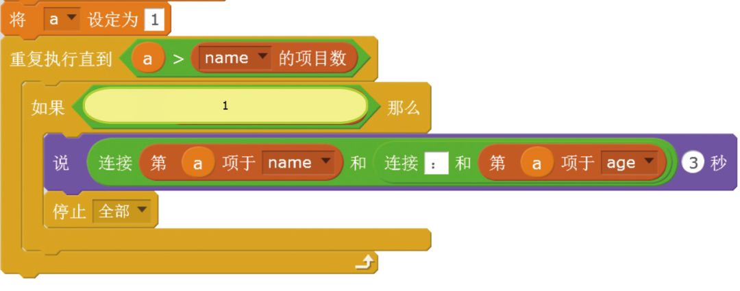 4. 如果在列表name中找到key,则由Scratch小猫说出相应的学生姓名和年龄,并终止程序。那么绿框 1 处应该填写什么内容?