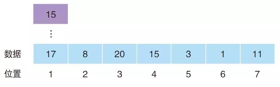 该数组中有7个数据,首先与第一位数据17进行比较,与我们要搜索的数据15不同,因此移动到下一步。