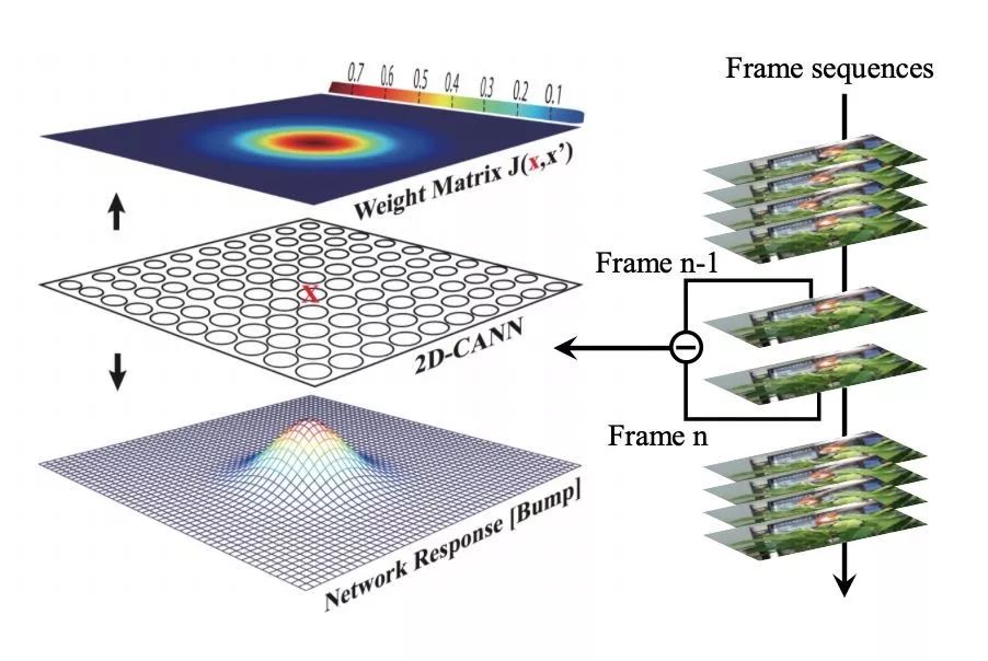 接收对应位置像素强度的前后帧差分信号刺激时,网络便可实现目标追踪。