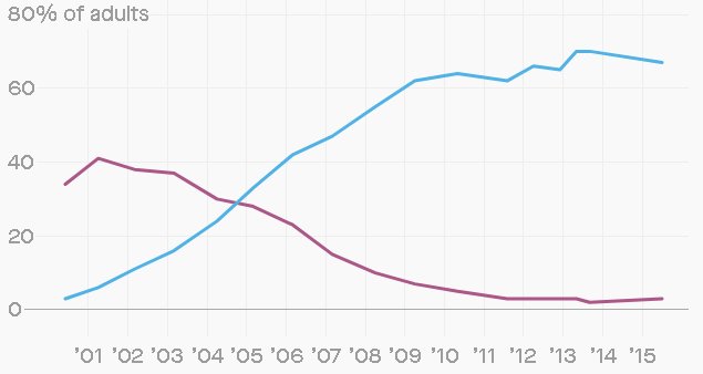 皮尤研究中心(Pew Research Center)表示,在2004年的某个时候,美国使用宽带互联网的人数第一次超过了拨号上网的人数。
