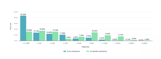 内存设置方面也出现了类似的趋势,容器中的实例往往体量更小。New Relic 数据显示,只有大约 80% 的容器化应用程序会通过 -Xmx 或者 -XX:MaxRAMPercentage 标记明确设定 JVM 内存上限。从版本 9 开始,JVM 引入了新的容器感知功能,而且有可能引发安全隐患。但只要各容器中只运行 JVM 这一个进程,那么容器感知就不会影响应用程序的安全水平。