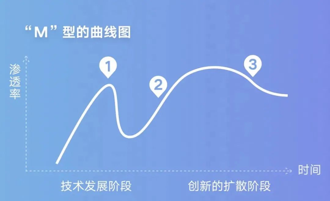 他将“技术成熟度曲线”和“创新扩散曲线”这两个分析框架连在一起,组成了一条M型曲线。