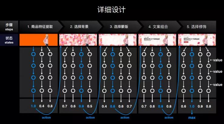 行动器根据「鲁班」收到的设计需求,从学习网络中抽取设计原型,并从元素中心中选取元素,规划输出多个最优生成路径,完成图片设计。