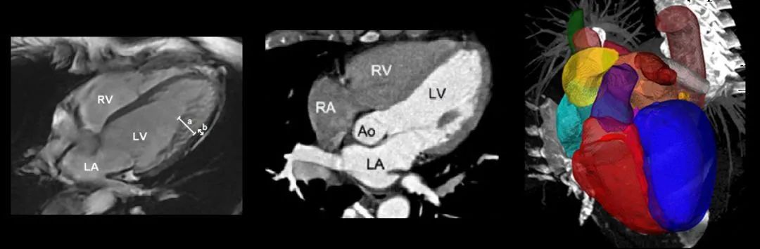 简单来讲,左心室是一个厚壁的圆柱形区域,而右心室是一个不规则形状的物体,较薄的心室壁有时会与周围的组织混在一起。