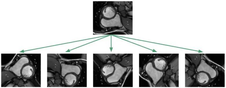 与其他数据不足的场景相同,医学图像也可以借助数据扩张实现网络的训练。比如下图所示,通过随机旋转、平移、缩放、裁剪、弹性形变等手段,对原始图像进行变换: