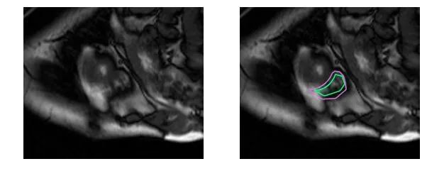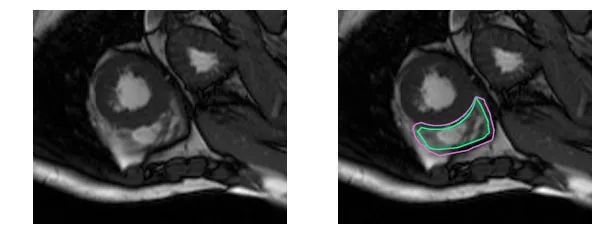 下面用几组图片来感受一下这种分割问题的困难。下图是右心室的MRI图片: