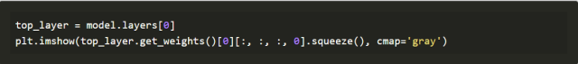 另一种方法是绘制训练模型的过滤器,这样就可以了解这些过滤器的表现形式。例如,第一层的第一个过滤器看起来像: