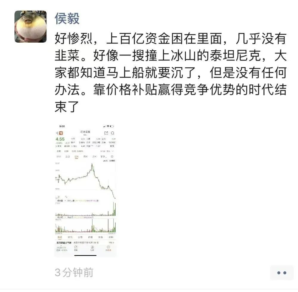 近日,盒马CEO侯毅在朋友圈向叮咚买菜开炮,称叮咚买菜上百亿资金困在里面,船要沉了,靠价格补贴赢得竞争的时代结束了。侯毅还配了一张叮咚买菜股价的图片。(凤凰网财经)