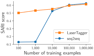 数据效率:即使训练样本只有几百几千个,LaserTagger 也能生成合理的输出文本。实验显示,seq2seq 基线模型需要数万个样本才能实现类似性能。