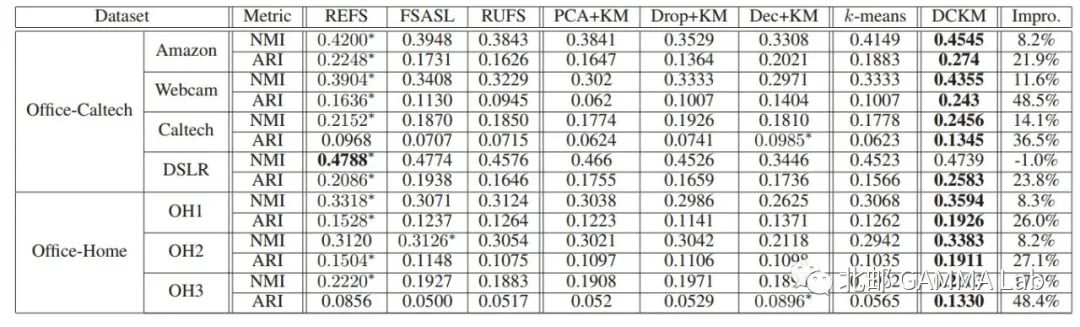 表1 在两个数据集上进行聚类结果。''*''表示基准的最佳性能。所有方法的最佳结果以粗体显示。最后一列表示与最佳基准相比,所提出的方法相比最佳对比方法所获得的改进百分比。
