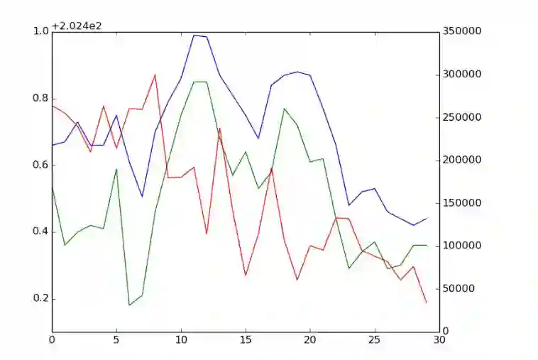 最终,我尝试了两种以上的投入。第一种与原始图像数据相似,因为它使用了价格序列的时间–域表示,只不过我还使用了volume数据,它是用红色标绘在不同的轴上的。如图4所示。