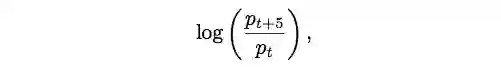 具体来说,回归问题是:从时间t-30到时间t作为输入给出高价格和低价格的图像,作为输出预测从时间t到时间t + 5的对数返回,即预测: