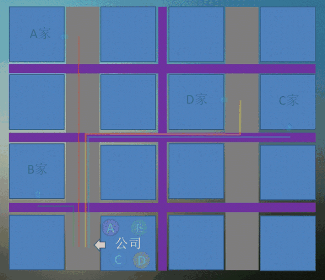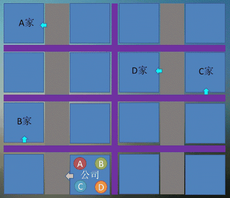 同时出发,假定灰色道路为快速路通行能力为可同时通行2辆车,紫色道路为普通道路同时间仅能通行1辆车,从一个路口到另一个路口需花费2个单位时间。假设四人发车顺序为A-B-C-D,那么: