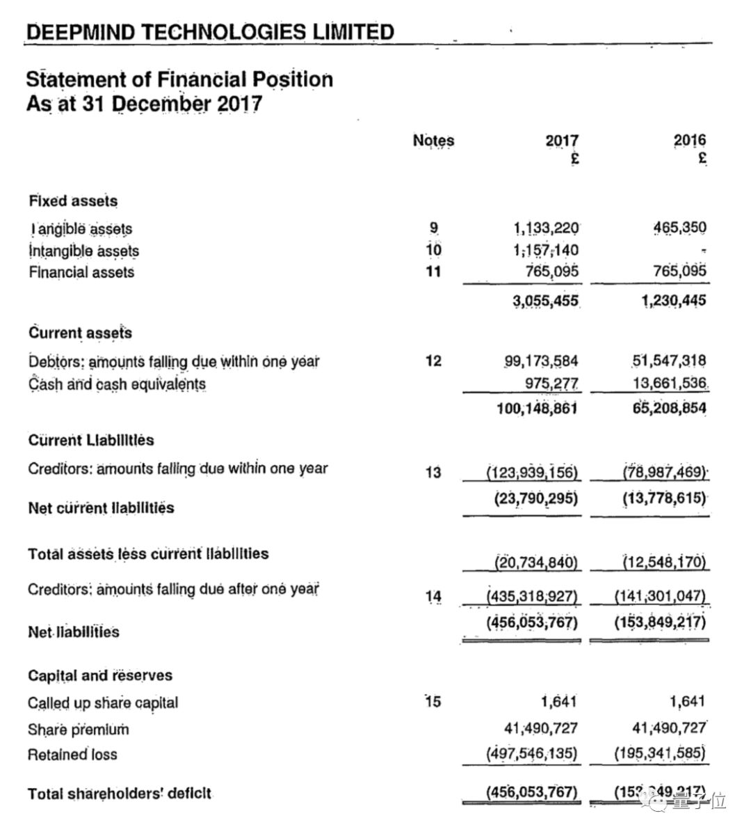 截至2017年12月31日,DeepMind持有现金和现金等价物97.5万英镑,账面上亏损4.98亿英镑。