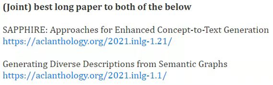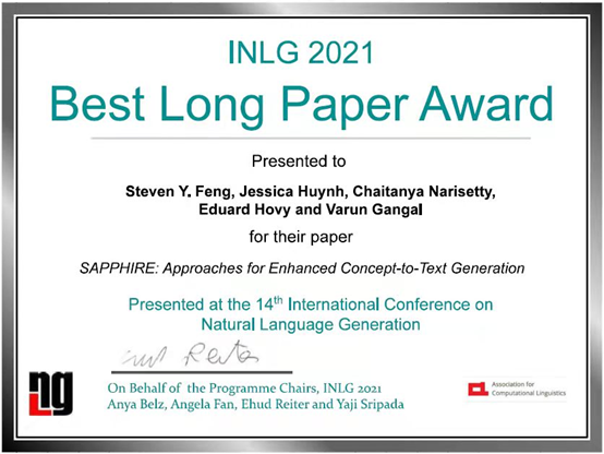 最新消息,华人学者 Steven Y. Feng 与四位学者Jessica Huynh、Chaitanya Narisetty、Eduard Hovy与Varun Gangal 共同发表的题为“SAPPHIIRE: Approaches for Enhanced Concept-to-Text Generation”的研究论文获得了2021年 INLG 的最佳长论文奖!