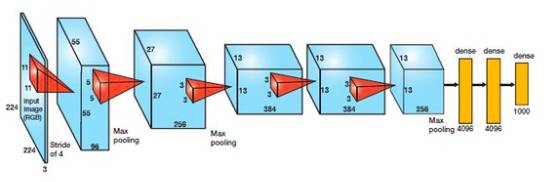 该架构是第一批采用比传统方法更大的步幅来提升 ImageNet 分类准确率的深层网络之一。它包括 5 个卷积层、3 个全连接层,如下图所示。