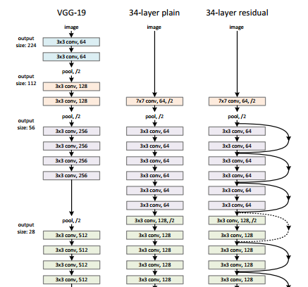 该网络的架构和 VGGNet 类似,主要包括 3x3 的卷积核。因此可以在 VGGNet 的基础上在层之间添加捷径连接以构建一个残差网络。下图展示了从 VGG-19 的部分早期层合成残差网络的过程。