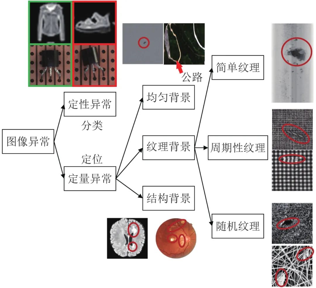 图像数据中每一个像素点上的像素值就对应着一个观测结果. 由于图像内像素值的多样性, 仅仅分析某一个点的像素值很难判断其是否属于异常. 所以在大部分图像异常检测任务中, 需要联合分析图像背景以及周围像素信息来进行分类, 检测的异常也大多属于上下文或者模式异常. 当然, 这三种异常类型之间并没有非常严格的界限. 例如, 有一部分方法就提取图像的各类特征[27], 并将其与正常图像的特征进行比较以判断是否属于异常, 这就将原始图像空间内模式异常的检测转换到了特征空间内点异常的检测. 图像异常检测任务根据异常的形态可以分为定性异常的分类和定量异常的定位两个类别. 定性异常的分类, 类似于传统图像识别任务中的图像分类任务, 即整体地给出是否异常的判断, 无需准确定位异常的位置. 如图2左上图所示, 左侧代表正常图像, 右侧代表异常图像, 在第一行中, 模型仅使用服饰数据集(Fashion mixed national institute of standards and technology database, Fashion-MNIST)[28]中衣服类型的样本进行训练, 则其他类别的样本图像(鞋子等)对模型来说都是需要检测的异常样本, 因为他们在纹理、结构和语义信息等方面都不相同. 又或者如第二行所示, 异常图像中的三极管与正常图像之间只是出现了整体的偏移, 而三极管表面并不存在任何局部的异常区域, 难以准确地定义出现异常的位置, 更适合整体地进行异常与否的分类.