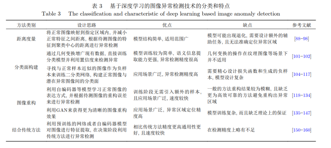近年来, 深度学习在计算机视觉中的各个领域内都得到了长足的发展. 相比于传统的方法, 深度学习由于其无需人工设计特征, 算法通用性更高等优点, 已经被广泛引入到了图像异常检测任务当中. 现有的方法大致可以分为以下几类: 基于距离度量的方法、基于分类面构建的方法、基于图像重构的方法和与传统方法相结合的方法.