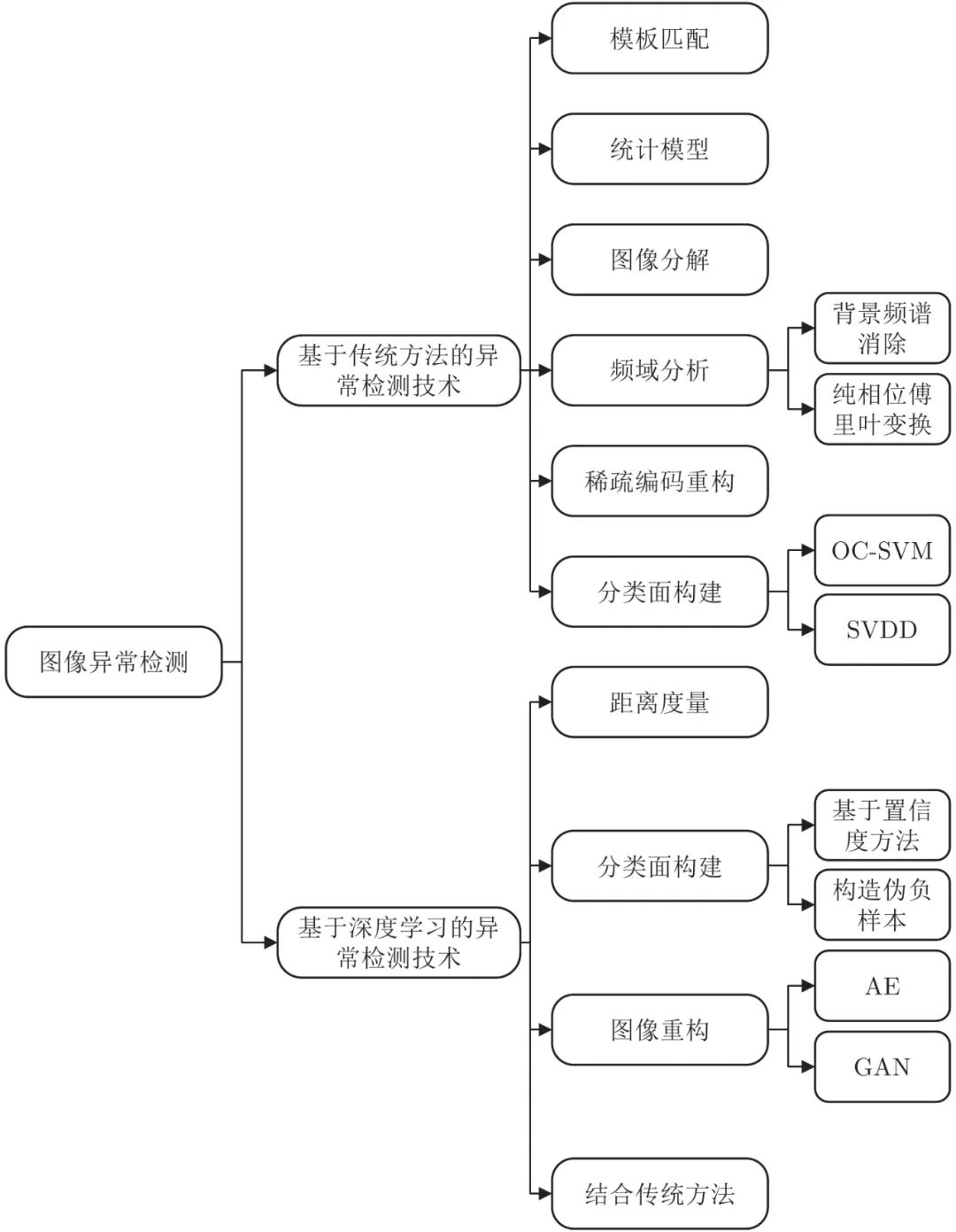 图像异常检测是计算机视觉领域的一个热门研究课题, 其目标是在不使用真实异常样本的情况下, 利用现有的正 常样本构建模型以检测可能出现的各种异常图像, 在工业外观缺陷检测, 医学图像分析, 高光谱图像处理等领域有较高的研 究意义和应用价值. 本文首先介绍了异常的定义以及常见的异常类型. 然后, 本文根据在模型构建过程中有无神经网络的参 与, 将图像异常检测方法分为基于传统方法和基于深度学习两大类型, 并分别对相应的检测方法的设计思路、优点和局限性 进行了综述与分析. 其次, 梳理了图像异常检测任务中面临的主要挑战. 最后, 对该领域未来可能的研究方向进行了展望.