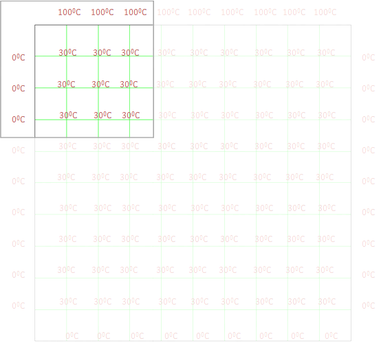 下面让我求解这个方程。为了求解这个方程,首先使用为所有的绿色节点假设一个猜测值,此处的猜测值是 30 摄氏度,当然你也可以设置为 35 摄氏度,因为我们并不知道其具体是多少度,这只是一个假设值。我们将迭代这个方程,直到迭代前后值的误差非常小为止,我们称之为收敛。在迭代的过程中,节点的温度值会自动的调整,所以当我们的猜测值越接近真实值,求解的速度就越快。