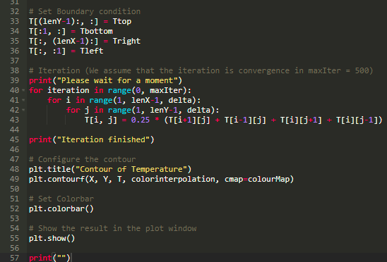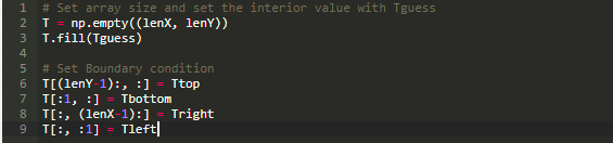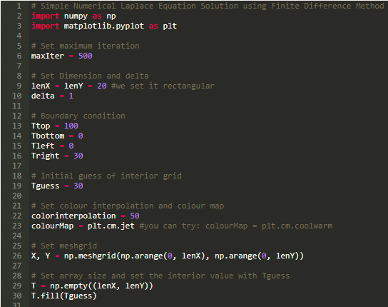 np.meshgrid() 函数可以产生网格,用这个可以画出最后的结果,其中第一个参数代表 x 轴,第二个参数代表了 y 轴。我们使用 np.arange() 来产生一个一维数组,其起始于某一个值,终止于某一个值,在本例中,起始于 0 终止于 lenX,另一个起始于 0 终止于 lenY。接下来,我们生成一个二维数组,定义其形状,并使用猜测值对其进行初始化,然后我们设置边界条件,使用前面给出的边界条件进行初始化。