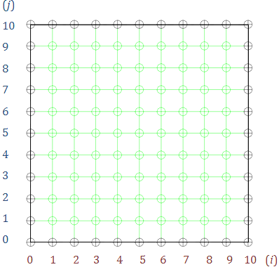 我们求解的问题是:在给定边界温度的情况下,求出二维平面内每点的稳定温度(即为拉普拉斯方程的解)。下面,我们将离散化整个二维平面,使用方格将其分割,然后使用有限差分法将拉普拉斯方程进行离散化。下图展示了离散化后的平面区域。