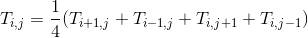 其中,绿色的节点代表了我们想求解的节点,白色的节点是边界条件,我们已知其温度。下面给出离散化的拉普拉斯方程形式。