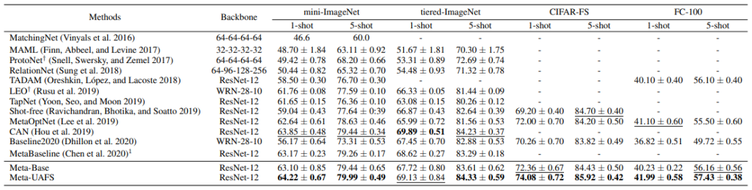与 SOTA 方法的性能对比:研究员们在 mini-ImageNet、tiered-ImageNet、CIFAR-FS 和 FC-100 四个通用小样本图像分类数据集上,将所提出的不确定性感知小样本图像分类模型与 SOTA 方法进行性能对比,实验结果如表3所示。实验证明了本文提出的方法在大多数情况下均能超过已有 SOTA 方法。