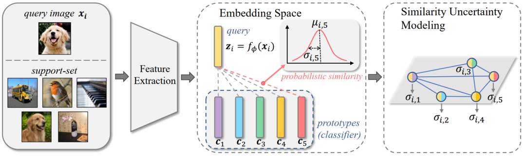 在基于度量学习的小样本图像分类中,“样本-类中心”对的相似度由样本和类中心在特征空间中的表征共同决定。因此与之前的工作不同,本文的方法不再对特征表征的不确定性建模,而是对特征相似度的不确定性进行建模。(如图1)