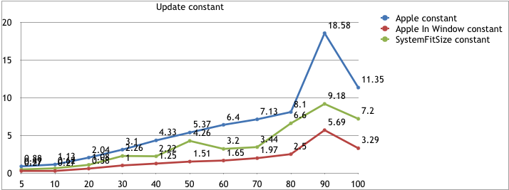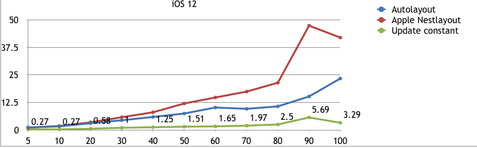 因为这里没有不含 UILabel,UIView 等有 intrincContentSize 的 UIView,update constant 基本就是 Cassowary 更新约束的耗时。Applelayout 和 Apple NestLayout 则也包含 UIView 创建,约束创建和求解的时间。