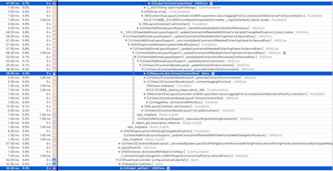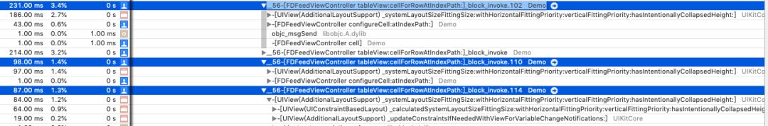 这是 FDTemplateLayoutCell profile 的一段结果,展开部分是 cellForRowAIndex 里运行的代码。