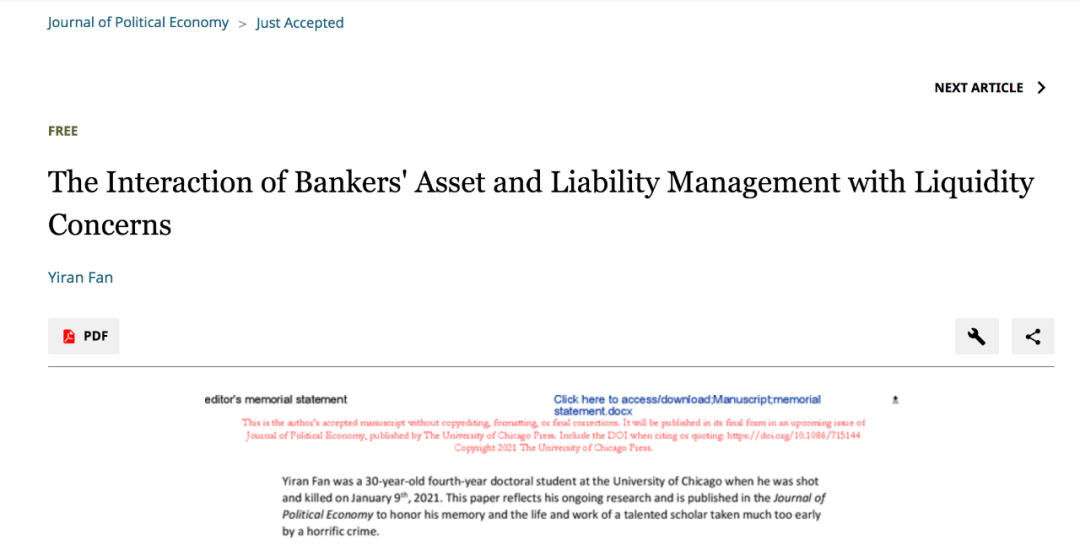 这篇文章题为“The Interaction of Bankers' Asset and Liability Management with Liquidity Concerns”,可译为《银行资产负债管理与流动性问题的互动》,被国际顶级学术期刊《Journal of Political Economy》所接收。范轶然是该文的唯一作者。