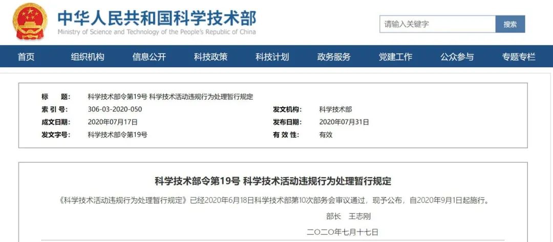 7 月 31 日,科技部正式公布 19 号令《科学技术活动违规行为处理暂行规定》,自 2020 年 9 月 1 日起施行。明确了 5 类违规主体,尤其是对于第三方的科学技术服务机构及工作人员,这是首次见到把范围的工作人员纳入违规主体里的;也明确了 6 类违规行为的具体行为,并且针对 6 类违规行为出了 10 大处理措施。