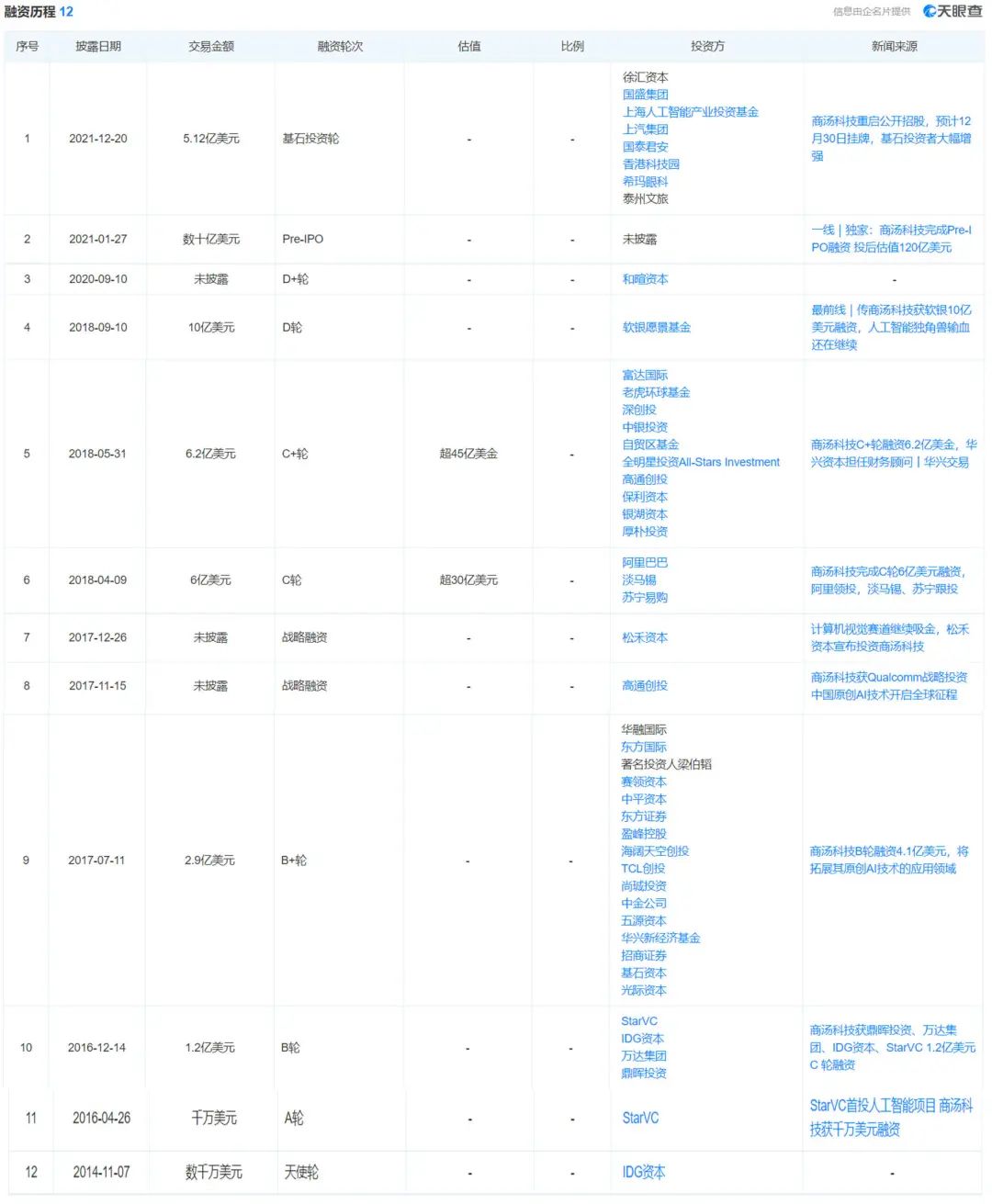 据天眼查显示,成立七年间,商汤科技完成了 12 轮融资。