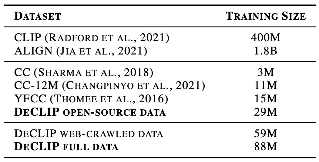 DeCLIP数据集包含现有开源的29M和互联网爬取的59M两部分,共88M数据。