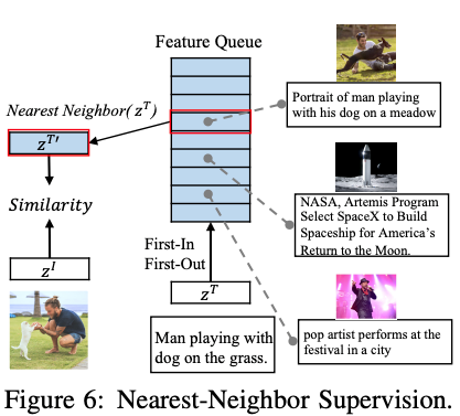 因为相同的图像可能会有类似的语言描述,因此选择语言描述相似的图文对进行对比学习。通过维护一个先入先出(FIFO)的队列来模拟整个数据分布,从这个队列中选取最相似的句子作为正样本,并在选取的之间使用InfoNCE损失函数作为最近邻损失函数。