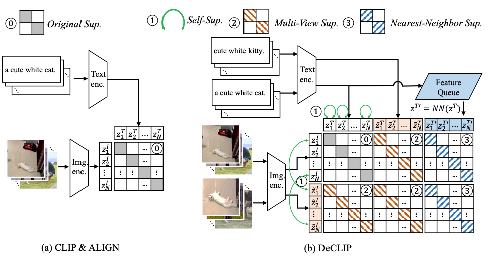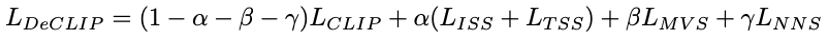 原始的CLIP直接使用图像和文本的嵌入计算自监督InfoNCE损失,而DeCLIP中使用的是数据增强后的文本和图像,进行四次InfoNCE,相比CLIP多了三倍的量。具体来说,对于原始图像文本对,DeCLIP将图像进行数据增强得到