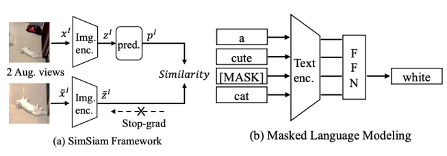 按照SimSiam提出的方式进行图像级别的自监督学习。图像通过两个数据增强得到两个视图,它们会先被共享权重的图像编码器编码,然后其中一个视图会通过一个两层的MLP进行特征的增强,并与另一个视图的输出计算余弦相似度并回传梯度。