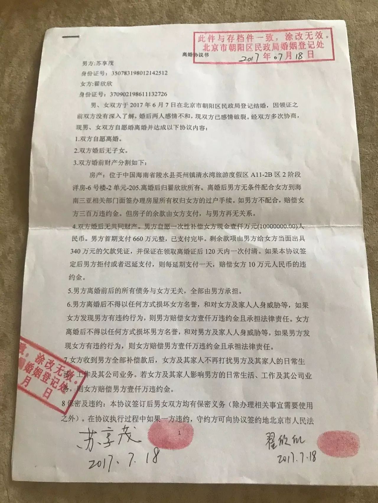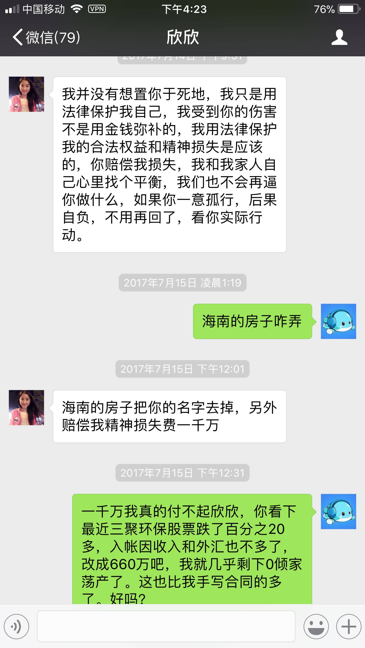 她竟然索要1000万天价还有三亚的房子归她。还请了个素质极低的流氓律师各种恐吓我。