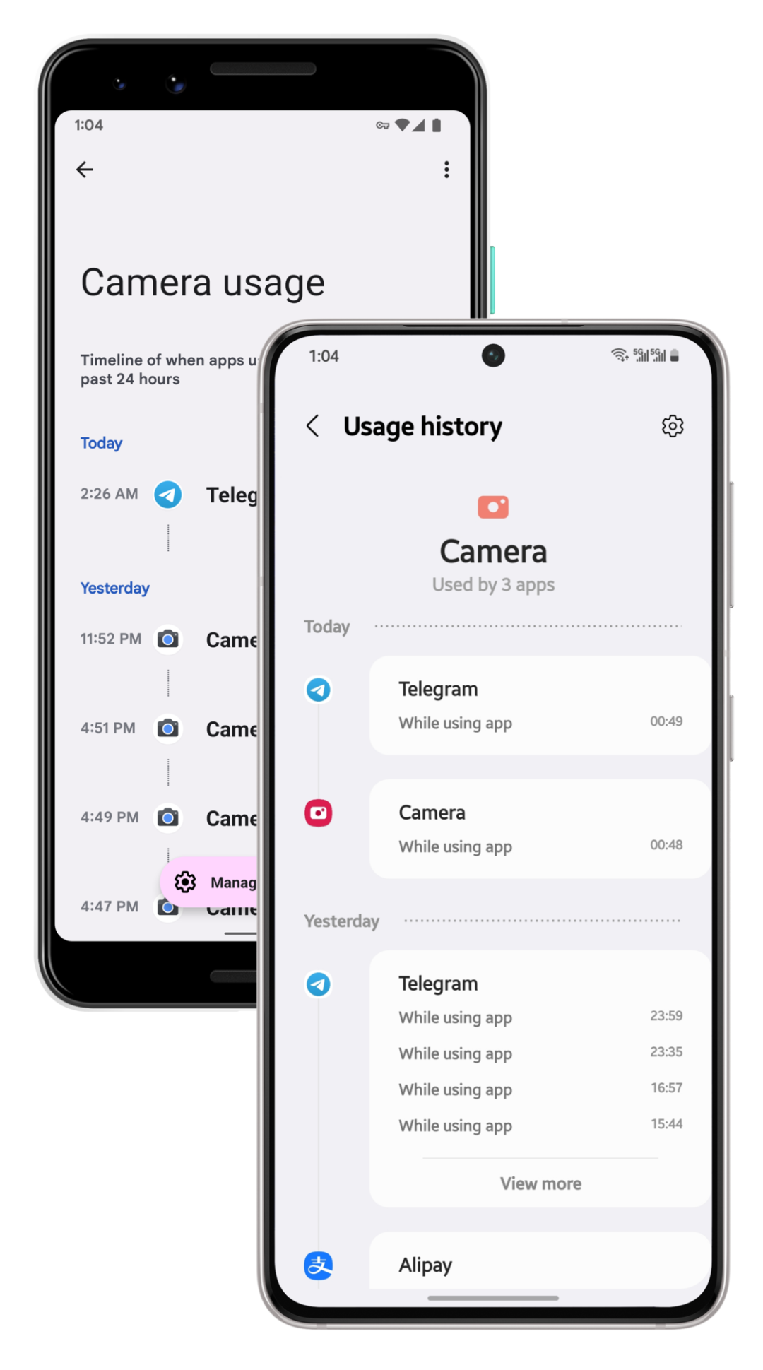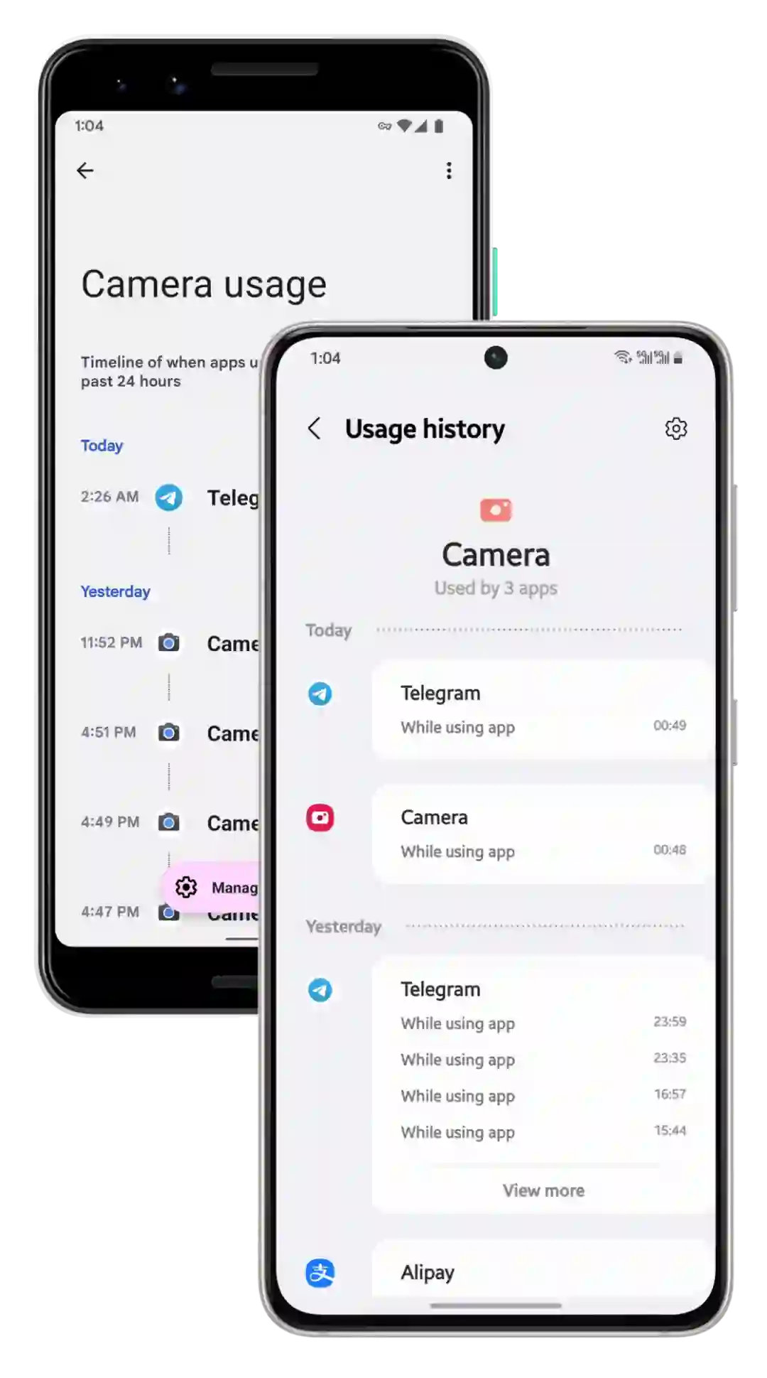 另一项大家喜闻乐见的功能则是右上角绿色的摄像头与麦克风实时调用指示灯,对比 Pixel 上面的 Android 12,三星原汁原味地保留了权限指示灯的启动逻辑与动画。快速设置面板中也可以添加相机与麦克风的访问权限按钮。与此前开发者模式中隐藏的 Sensors Off 开关不同,通过快速设置/隐私设置关闭访问后应用仍可正常使用,但捕捉的相机/麦克风数据为空。