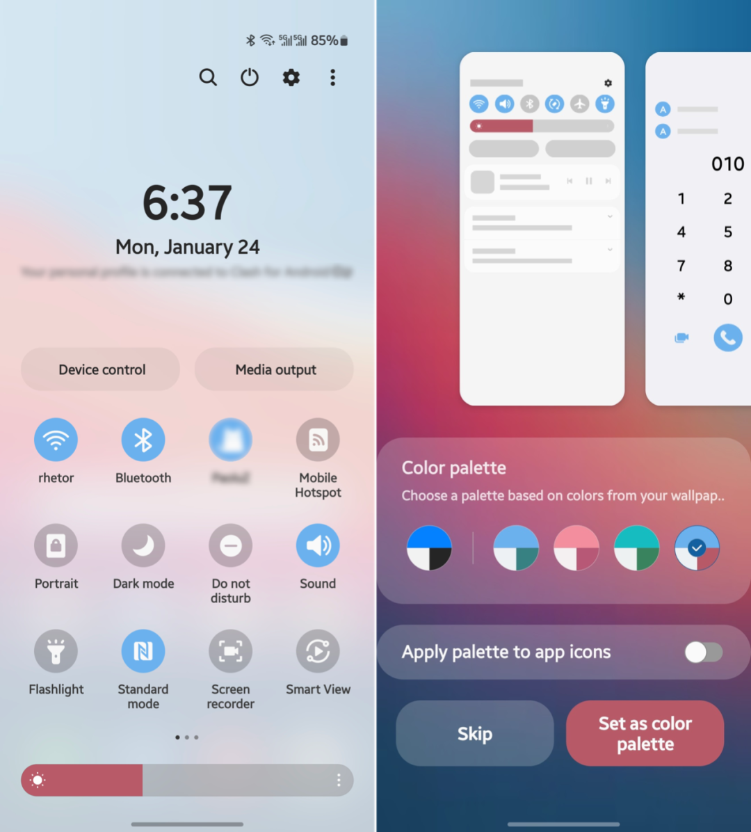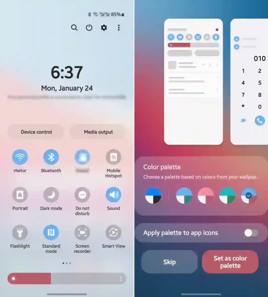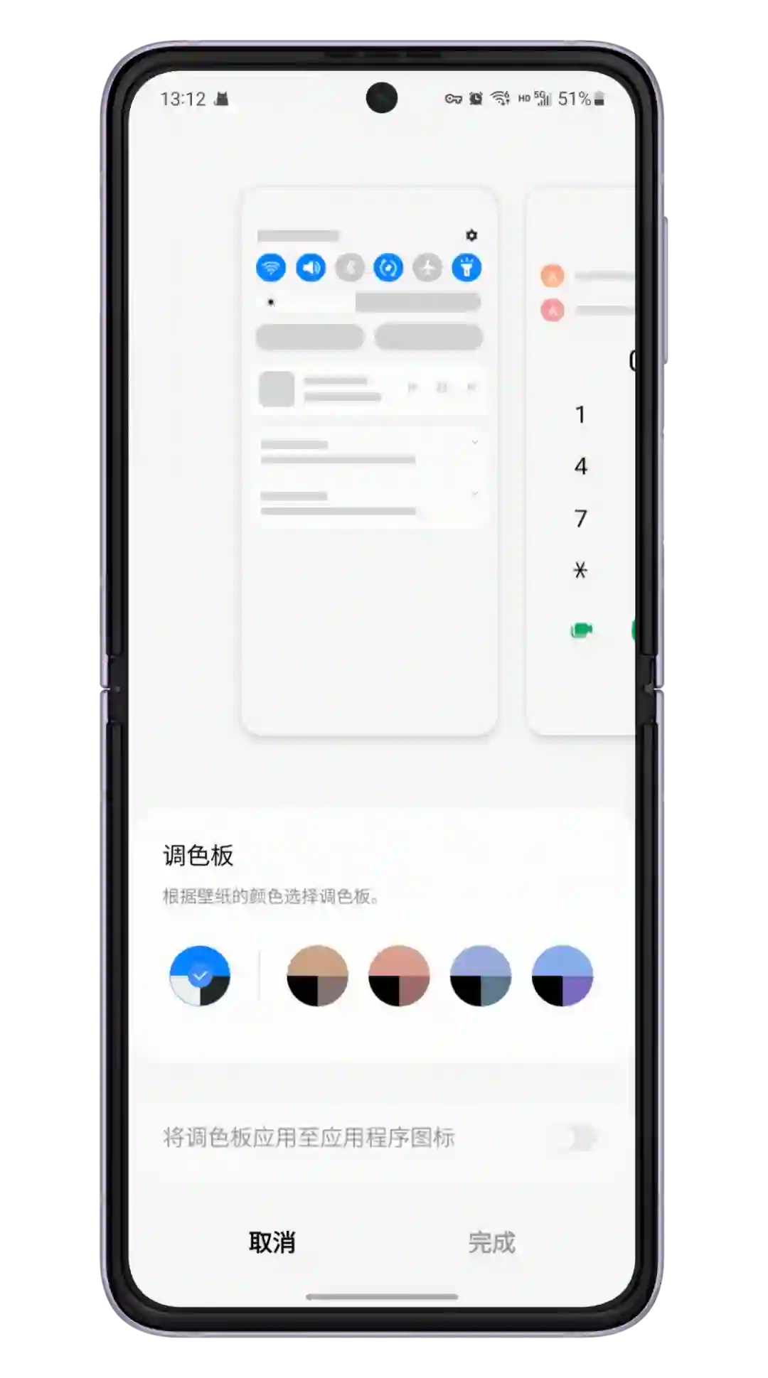 One UI 4 内置了一个名为「调色板」的功能,在设置壁纸之后会跳出提示,以自动取色的形式设置系统主题色。