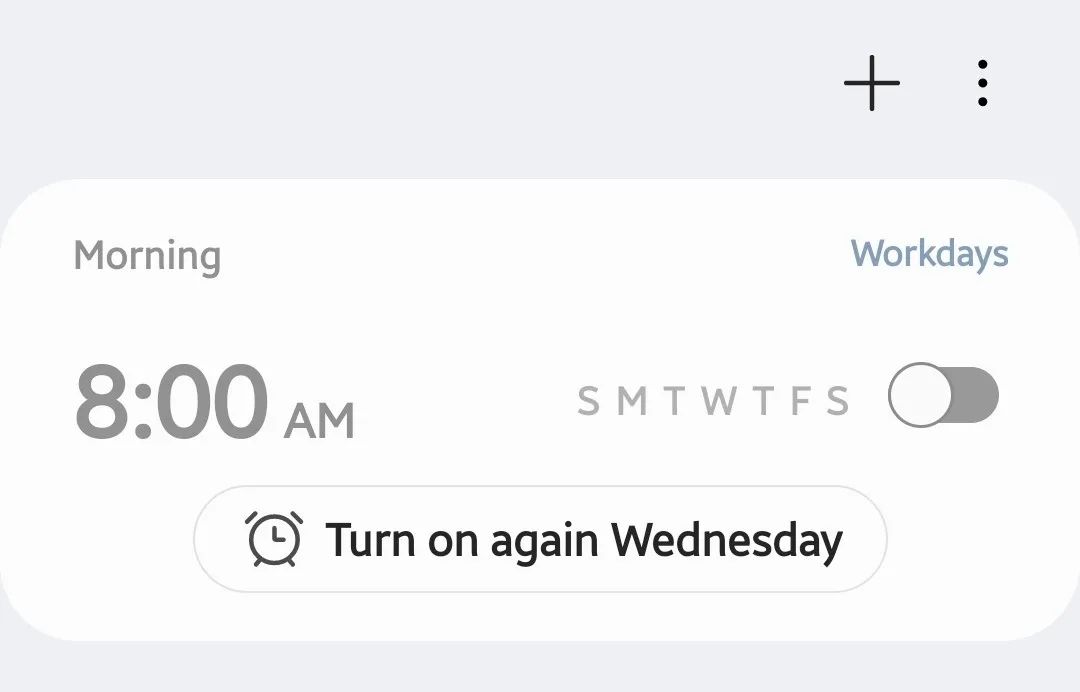 虽然此项功能并非 One UI 4 独占,但是系统里多了这些贴近用户使用习惯的小功能还是十分令人暖心的。在原本节假日闹钟的基础上,One UI 会在你关闭某个已经打开的闹钟之后在下面弹出一个小开关,询问你是否在明天再次将这个闹钟打开——从而有效避免了「对不起!忘记打开闹钟了」的窘况。