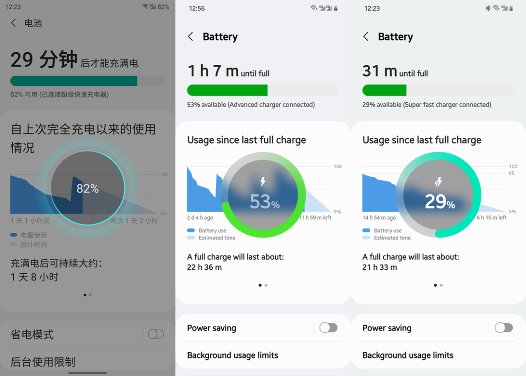 左:One UI 3 充电界面;中:One UI 4 快速充电;右:One UI 4 超快充电