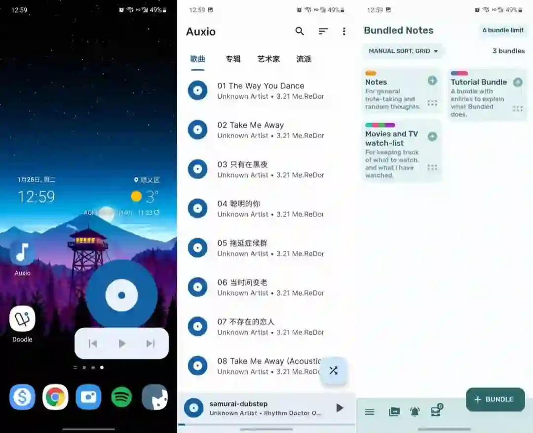 非常有趣的是,我们随机测试了一部分适配 Material Design 的第三方 App,动态壁纸应用 Doodle 的图标、笔记应用 Bundled Notes 的应用界面以及本地播放器 Auxio 的界面和小组件都可以正常适配调色盘。但在