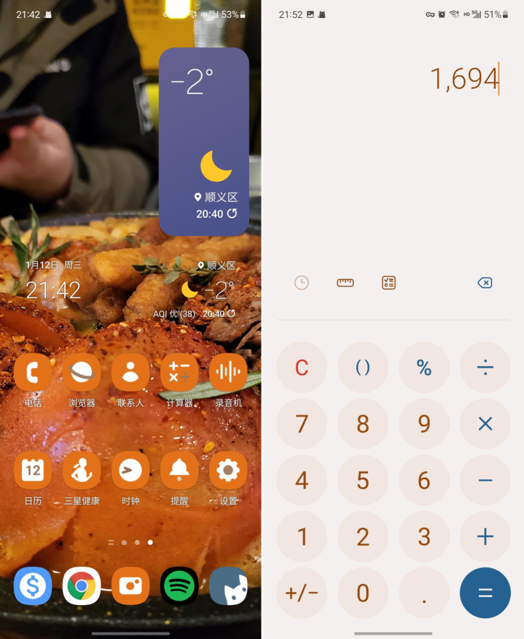 经过测试,你目前可以在电话、计算器、联系人、设置、时钟、提醒、我的文件、信息和智能管理器内观察到全局颜色调整带来的改变。但由于目前 One UI 并未采用原生 Android 12 以色块为主的设计,因此自动取色最直观的结果只呈现在系统设置内的开关与系统应用在默认启动器内的图标颜色上,以及通知栏快捷开关的按钮、锁屏与 AOD 的时钟字体颜色——但是后面这些选项即使在前几个版本的 One UI 中也均可以通过系统设置手动调整,因此目前 One UI 4 所呈现的效果更像是主题颜色「自动化」。Pixel Launcher 中新增的应用图标长按菜单取色也未能得到支持,仍然延续了毛玻璃效果。