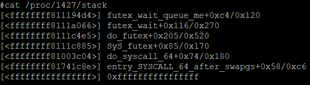 第三个字段就是task的状态。然后再查看/proc/${pid}/stack 文件就可以知道task 等在哪里。如: